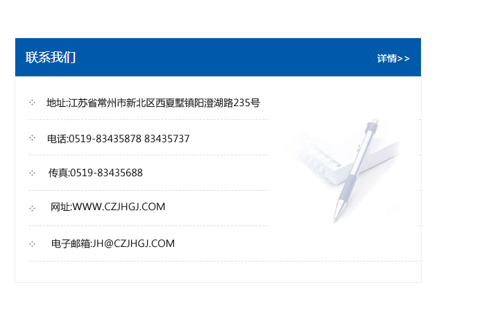 地址:常州市新北區友邦商務大廈1幢16、17層  電話:0519-85101652  傳真:0519-85112595  郵編:213022  網址:www.cz-jiayue_cn.czchuangqi.com  郵箱:xiajifengaa@163.com